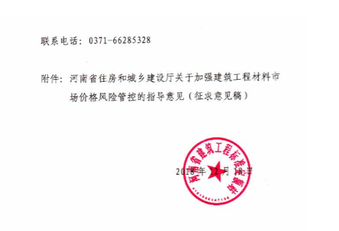 关于征求“河南省住房和城乡建设厅关于加强建筑工程材料市场价格风险管控的指导意见”的函发布时间:2019.07.31 作者:中和刚大工程顾问有限公司 浏览次数: